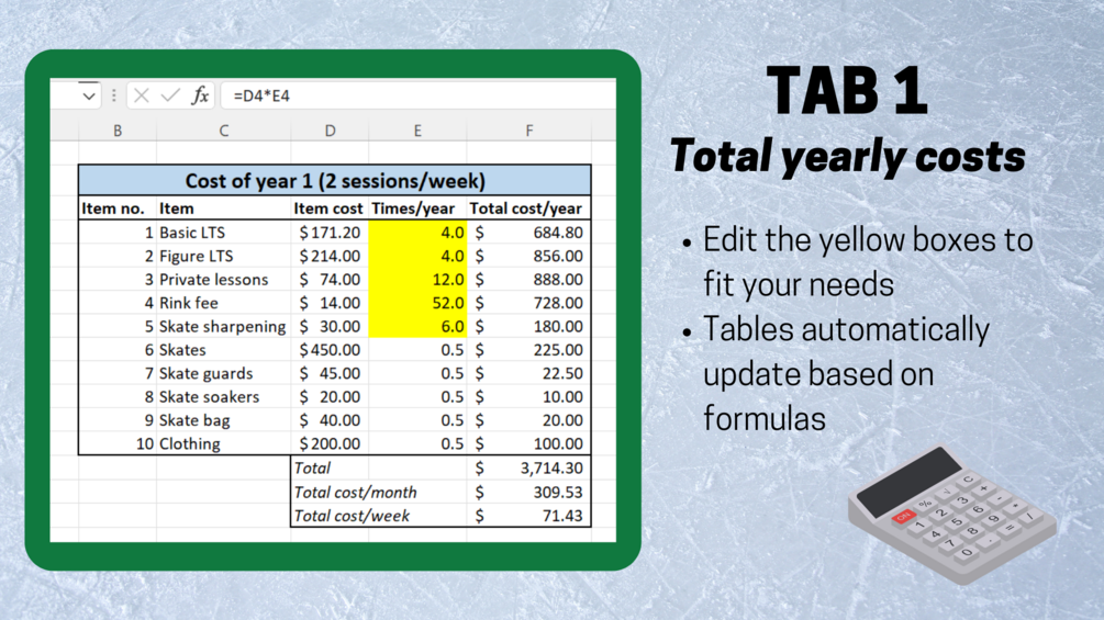This digital product is an editable Excel file that you can use as a template to calculate the cost of figure skating for you.